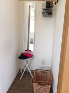 脱がれた服やお手回り品は写真右下の籠を使うことができます。